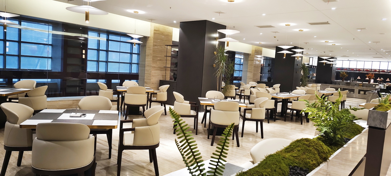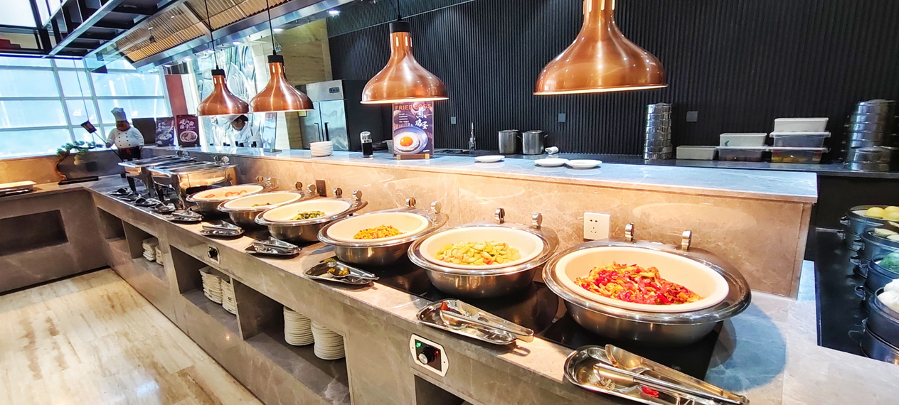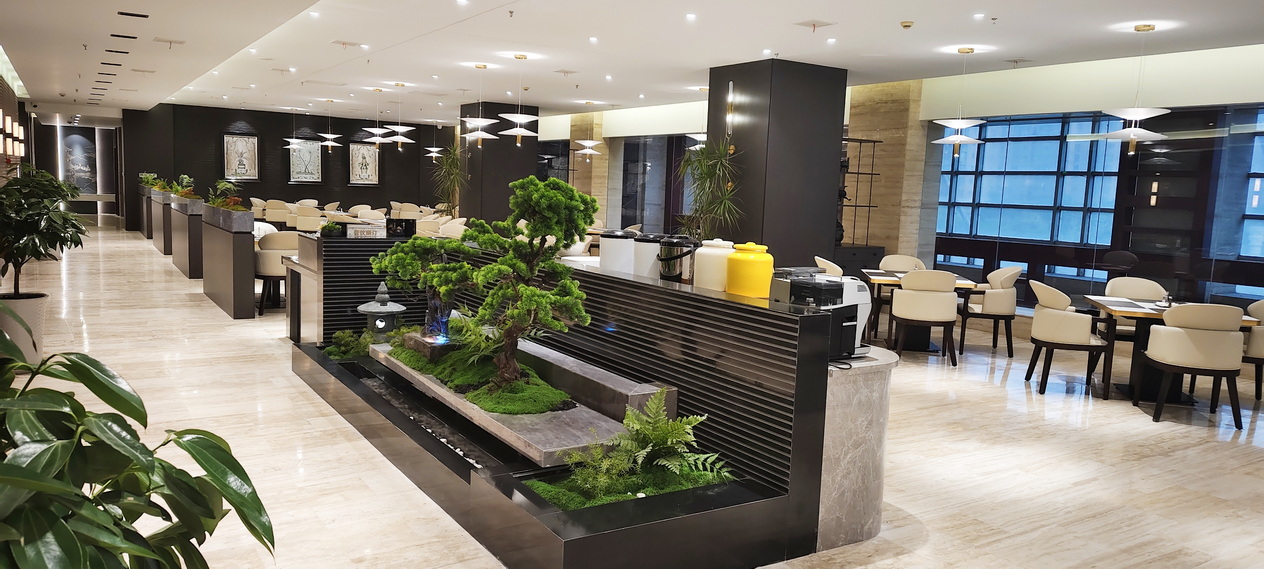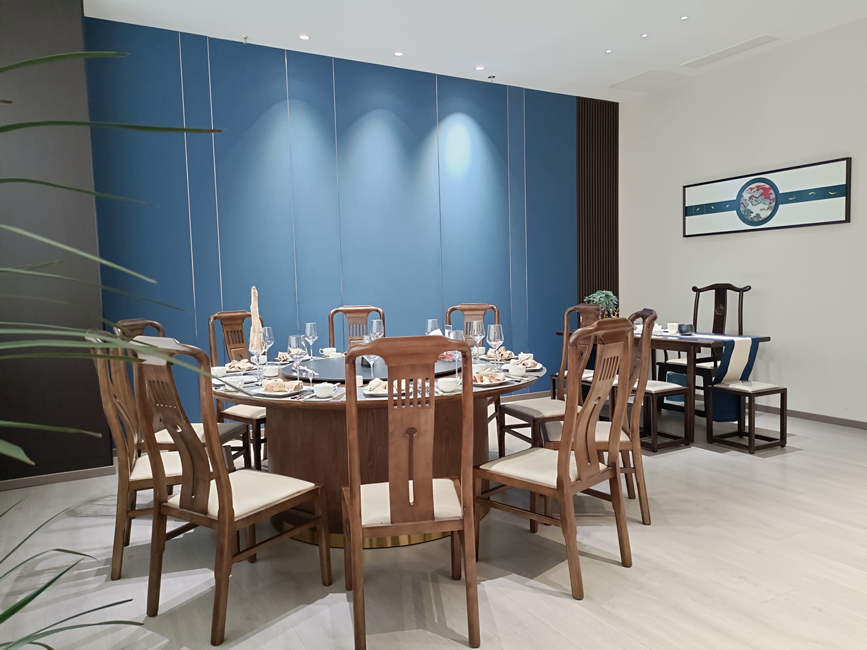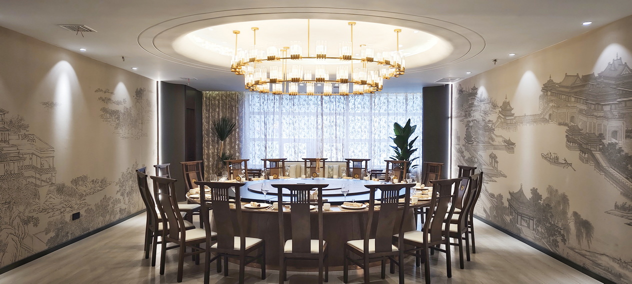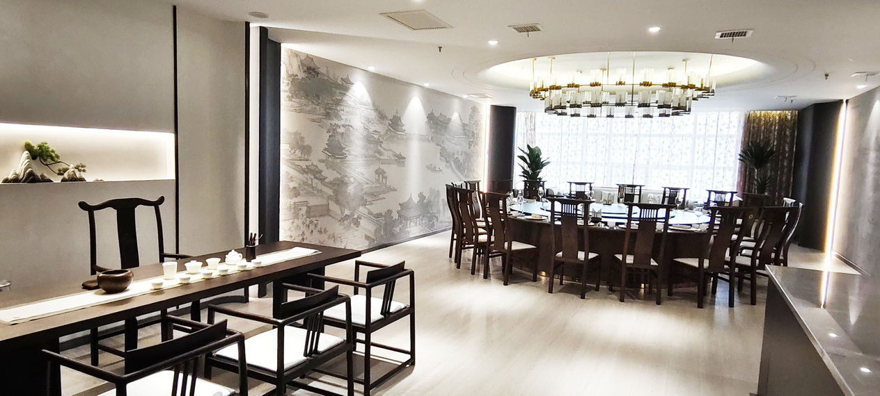 位于酒店1-4层,新中式装修布局风格,茶文化与餐桌文化相融合,主营粤菜,杭帮菜融合当地特色小吃、美食及各类应季时蔬,适时原料,本味烹制。可满足您商务宴请、亲朋聚会的接待需求