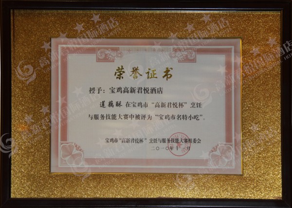 2010年11月中旬,酒店应宝鸡市文物旅游局之邀,成功协办宝鸡市“高新君悦杯”服务与技能大赛,并获得了包括“宝鸡市十大*菜”—高汤鱼素,“宝鸡市名特小吃”—莲藕酥,及前台问询、宴会服务、客房服务等优异奖项。